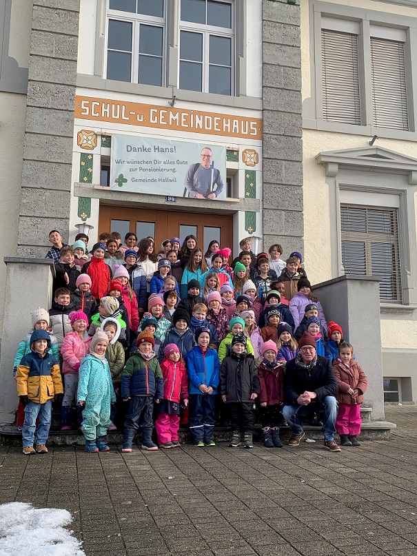 Der feierliche Höhepunkt folgte auf dem Schulhausplatz, wo die Schülerinnen und Schüler Hans mit einem persönlichen und selbstgedichteten Liedvortrag begrüssten und verabschiedeten.